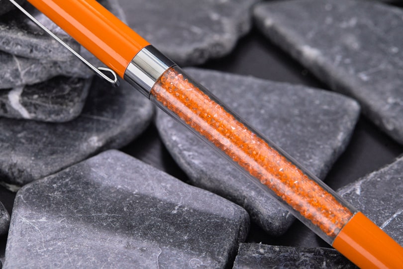Изысканная подарочная ручка-роллер из оранжевого лакированного металла. Корпус содержит закрепку из прозрачной ударопрочной смолы заполненной сияющими кристаллами Сваровски оранжевого цвета.