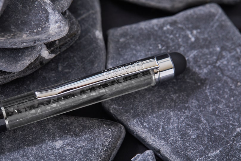 Классический дизайн в новой металлической подарочной ручке-стилусе с лаковым покрытием черного цвета. Дизайн отличается наличием прозрачной закрепки из ударопрочного пластика заполненной искрящимися кристаллами Сваровски в черном цвете.