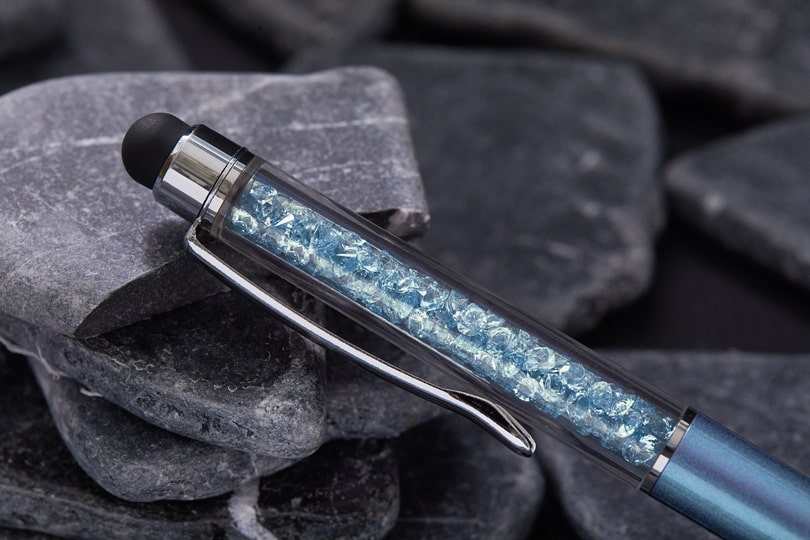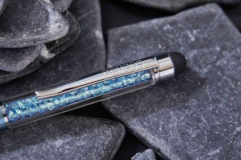 Очаровательный дизайн в новой металлической подарочной ручке-стилусе с лаковым покрытием синего цвета. Корпус оснащен прозрачной закрепкой из ударопрочной смолы заполненной сияющими кристаллами Сваровски синего цвета.