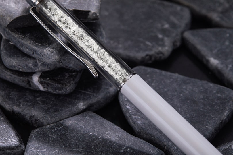 Мы создадим вашу персонализацию начиная с выплавления оригинальных клипов с вашим логотипом (молдинг), производства корпусов белого цвета и наполнения их прозрачной части (закрепки) кристаллами Сваровски белого цвета, подбора цвета чернил, и заканчивая подарочной упаковкой с вашим логотипом.