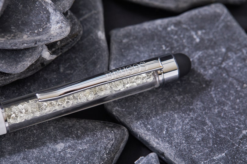 Нанесение логотипа компании на клип ручки-стилуса посредством газового лазера с ЧПУ является наиболее быстрым и бюджетным вариантом брендирования.