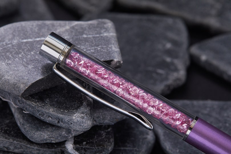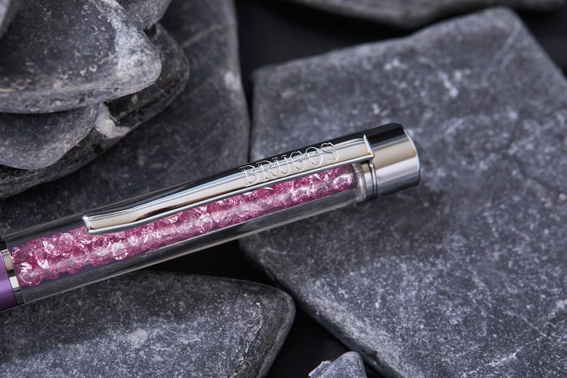 Исключительная версия металлической шариковой ручки с лиловым лаковым покрытием. Корпус снабжен закрепкой из прозрачного ударопрочного пластика заполненной блистающими кристаллами Сваровски лилового цвета.